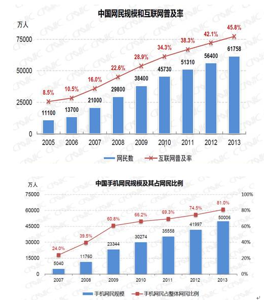 截至2013年12月,中国网民规模达到6.18亿,比2010年的4.57亿,增加1.6亿。互联网普及率(占全国总人口的比重)为45?8%,较2010年的34.3%,增长11.5%。手机网民规模达5亿,比2010年的3.03亿,增加 1.97亿(见图1、图2)。