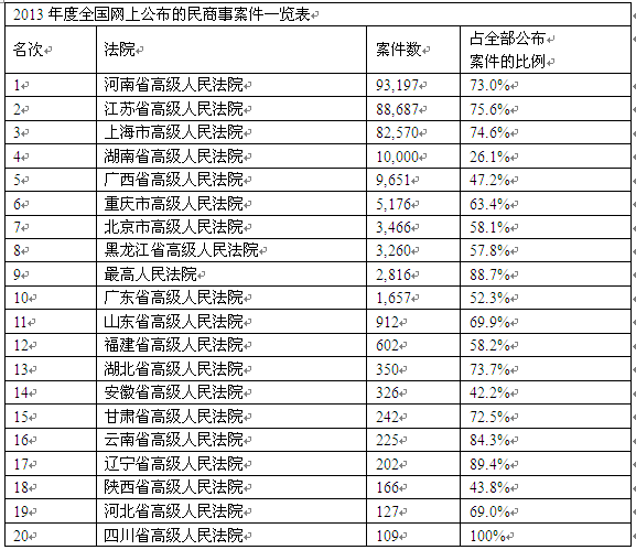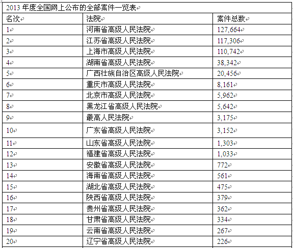 为直观反映我国裁判文书上网的具体情况,中国司法案例研究中心对全国2013年度裁判文书上网情况进行了初步的统计和分析。统计时间截至于2013年12月21日,统计的裁判文书包括新疆建设兵团法院等32个省级法院以及最高人民法院上网的裁判文书。鉴于中国裁判文书网于2014年1月1日才正式开通,本次统计数据主要依据最高法院和各省级法院网站上公布的裁判文书。在本次统计的各法院中,吉林省高级人民法院网站在访问时要么无法访问要么无法访问其他信息;海南省法院网站仅能检索单个案件,而无法统计2013年全年的案件数;新疆维吾尔自治区高级人民法院和青海省高级人民法院网站都未公布2013年的案件;贵州省高级人民法院网站上仅显示首页但无其他链接通道可供访问;西藏自治区高级人民法院网站一直处于“改版”状态而无法访问;新疆生产建设兵团分院网站和内蒙古自治区高级人民法院网站并未公布裁判文书;宁夏回族自治区高级人民法院并无专门门户网站。上述法院要么并无可供统计的裁判文书要么仅有为数不多的裁判文书。