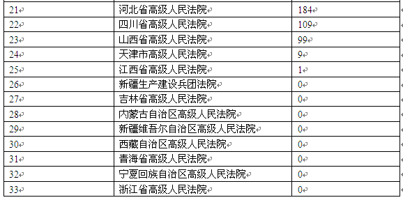 (二)所公布的刑事案件居中。由全国33家法院所公布的生效裁判文书来看,其中刑事案件数居中,总共公布了110,783件,占所公布全部生效裁判文书总数的24.8%。其中公布刑事案件数量最多的是河南省高级人民法院,共有41,416件,最少的是新疆生产建设兵团法院、吉林省高级人民法院、浙江省高级人民法院、四川省高级人民法院、内蒙自治区高级人民法院、新疆自治区高级人民法院、西藏自治区高级人民法院、青海省高级人民法院、宁夏回族自治区高级人民法院,都是0件;其中公布刑事案件数在10,000件以上的有4家法院,分别是:河南41,416件,占河南公布裁判文书总数的32.4%;上海24,180件,占上海公布的全部生效裁判文书的21.8%;江苏20,200件,占江苏公布的全部生效裁判文书的17.2%;湖南10,000件,占湖南所公布全部生效裁判文书的26.1%。全国各法院中有26个法院公布的刑事案件数都在1,000件以下。