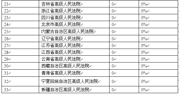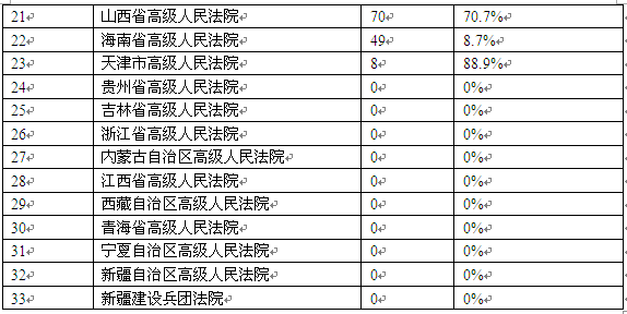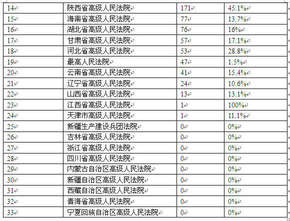 第二,贯彻裁判文书上网要求的积极性不高。由全国来看,仅有为数不多的法院积极贯彻最高法院关于裁判文书上网的政策要求。在2013年度,全国公布裁判文书数量居前三甲的法院分别是:河南省高级人民法院127,664件、江苏省高级人民法院117,306件、上海市高级人民法院110,742件,三者占全国公布裁判文书总数的比率分别是28.6%、26.3%、24.8%。三者公布裁判文书数量之和为355,712件,占全国公布裁判文书总数的79.6%。其他30家法院仅公布了91,004件,占全国公布裁判文书总数的20.4%。其中1家法院仅公布1件案件,还有8家法院没有公布1起案件。
