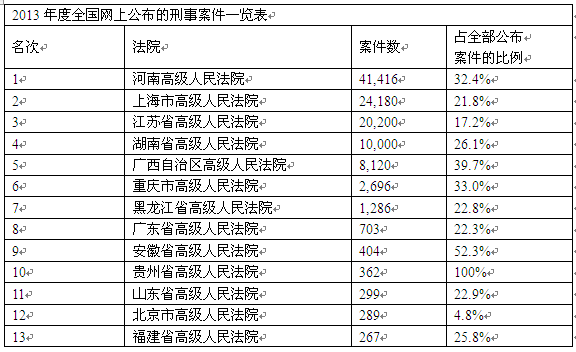 最高人民法院院长周强在2014年3月10日的十二届全国人大二次会议上作的《最高人民法院工作报告》中指出“2013年最高人民法院受理案件11,016件,审结9,716件;地方各级人民法院受理案件1421.7万件,审结、执结1294.7万件。”最高人民法院以及地方各级人民法院在2013年总共审结了1295.7万件案件。而根据本中心所统计的最高人民法院和各省级人民法院在2013年度所公布的446,716件裁判文书来看,我国在2013年仅公布了3.45%的生效裁判文书。[①]我国在2013年度大量生效法院裁判文书并未上网。