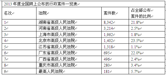 (三)所公布的行政案件为数不多。由全国来看,所公布的行政案件比较少,总共公布了18,464件,占全国全部公布生效裁判文书总数的4.1%。其中全国所公布行政案件数超过1,000件的仅有5家,分别是:湖南8,342件,占湖南公布全部案件总数的21.8%;河南3,214件,占河南公布全部案件总数的2.5%;上海1,962件,占上海公布全部案件总数的1.8%;北京1,402件,占北京公布全部生效案件总数的23.5%;江苏1,318件,占江苏公布全部生效案件总数的1.1%.由全国来看,各法院中有多达28家法院所公布的行政案件都在1,000件以下,其中还有包括最高法院在内的13家法院并没有公布1件行政案件。
