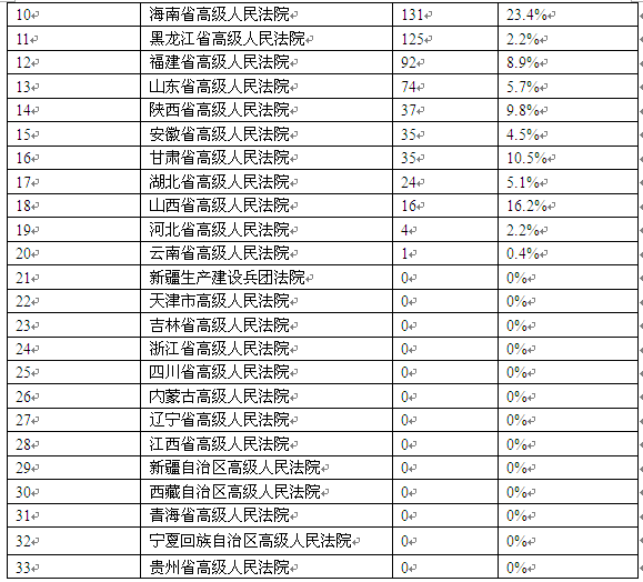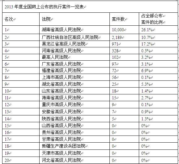 (四)所公布的执行案件最少。由全国来看,所公布的执行案件数量最少,总共公布了13,894件生效执行裁判文书,占全部公布生效裁判文书总数的3.1%.其中湖南省高级人民法院一家就公布了10,000件,占全国所有法院公布执行裁判文书总数的72.0%。在全国各法院所公布的执行案件中,在100件以上的仅有5家,分别是:湖南10,000件,占湖南所公布全部裁判文书总数的26.1%;广西2189件,占广西所公布全部生效裁判文书的10.7%;黑龙江971件,占黑龙江所公布全部生效裁判文书的17.2%;河南328件,占河南所公布全部生效裁判文书的0.3%;最高法院102件,占最高法院所公布全部案件总数的3.2%。由全国来看,有多达29个省(市、自治区)法院所公布的生效执行案件都在100件以下,其中有19个省(市、自治区)法院并没有公布1件执行案件。