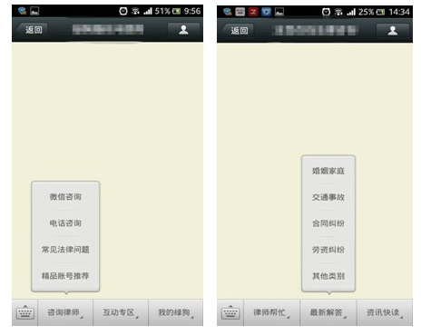 服务号直接置于微信联系人的根目录中,并无特别之处,但正是由于它的平凡,使得其更像是客户通讯录中一个能够提供专业法律服务朋友。客户与服务号的针对性问答及一对一的交谈模式,更能培养客户对服务号背后律师事务所的信任。同时,服务号运营者能够在聊天窗口下自定义菜单,并在菜单中设立不同的板块。在咨询法律问题前,客户可以通过服务号菜单了解律师或律师事务所的具体情况。