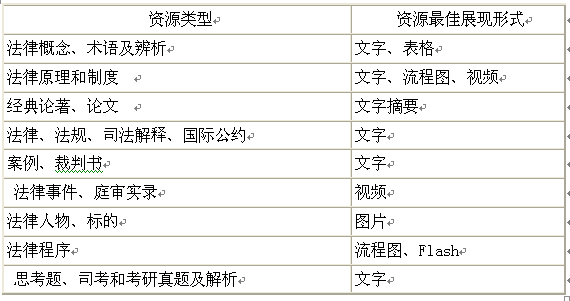首先,区分教材中的资源类型。法律教材中涉及的资源类型多种多样,不同的资源类型有其相应的最佳展现形式(见表1)。