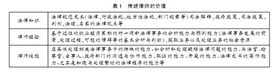 由于法律知识的丰富性、复杂性,对其全面、系统的掌握的难度是非常大的,在美国要获取律师执照,须在获得学士学位后再进入法学院学习三年,并通过艰难的律师考试。我国法学院众多,大量的法科学子在四年本科学习后,还须通过号称“天下第一难考”的国家司法考试,方可拿到进入律师行业的资格。律师的经验与技能需要长期的积累与锻炼,在不断的总结中得到提高 ,为行外人士难以企及。因此,传统律师的价值在很大程度上来源于其对法律知识、律师经验与技能的垄断,垄断性越强,则价值越高。