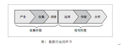 数据在处理过程中涉及很多环节,数据最初的产生、收集、存储,后续的处理、传输和分析,把它们笼统地分为两个阶段,即数据的收集阶段和数据的使用阶段,如图1所示。