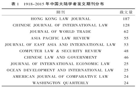 从表 1 可知,中国学者参与的国际核心法学研究发展脉络主要分为三个时期,萌芽期(1918-1983年),1918 年至 1983 年期间,中国学 者 参 与 的 国 际 法 学 文 献 为 20篇,占总发文量的,可见,中国参与的国际法学研究才刚刚萌芽。1932年至 1973 年间,为发文的空白期。波动期(1984-2003 年),1983 年迎来了中国学者参与的国际法学文献第一个高峰期,年度发文 6 篇,之后迅速下降。1985 年发文又降落为 1 篇,1987 年发文 22 篇,之后又迅速下降,1988 年发文 1 篇,直至2004 年,才出现发文的转折。因此可将这一阶段称为中国学者参与的国际法学文献研究的波动期。迅速发展期(2004-2015 年),从 2004年发文 12 篇开始,中国学者参与的国际法学文献数量呈迅速增长趋势,截至2015 年底,中国学者参与的国际法学学术文献达 1 145篇。